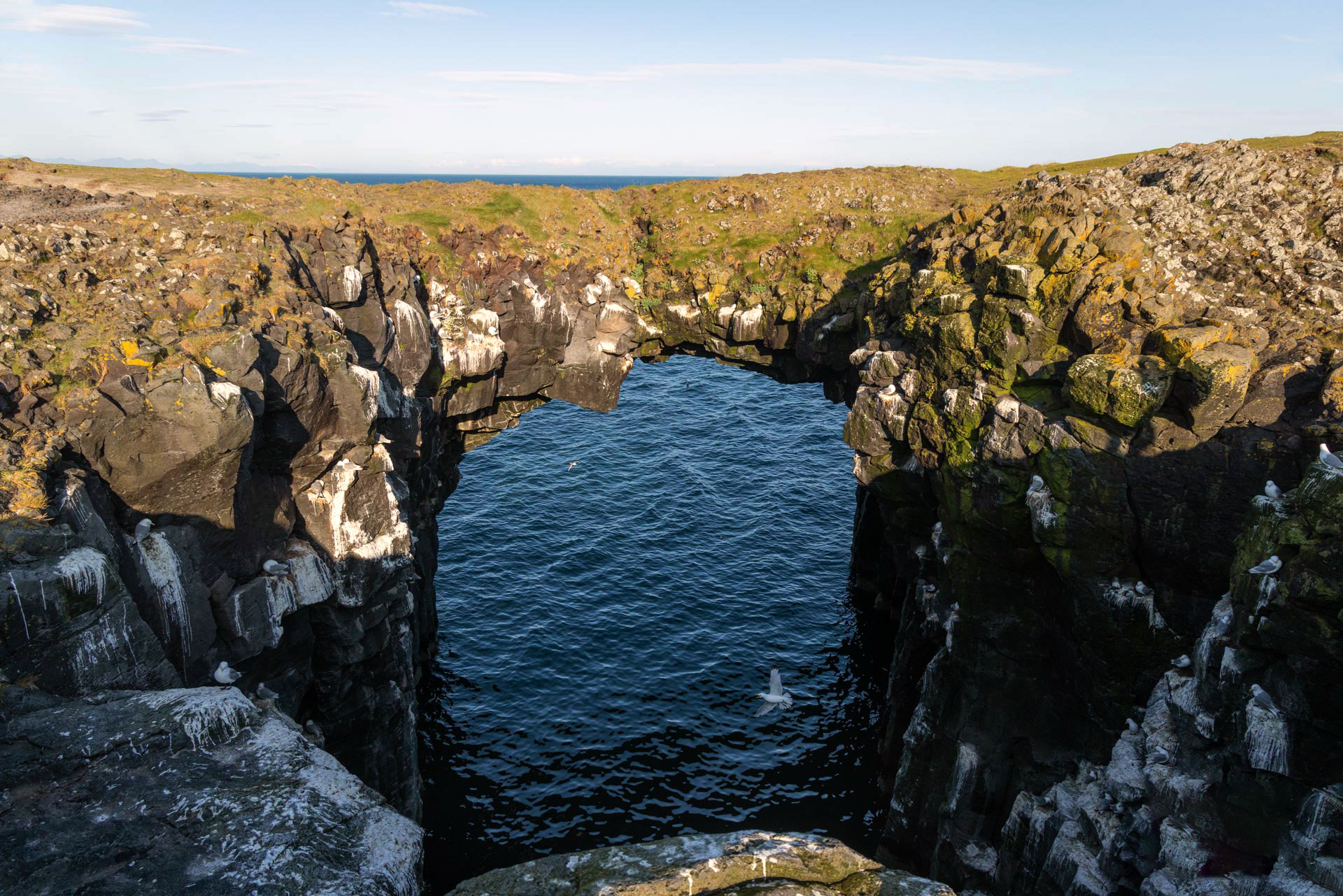 Just off the coast near Arnarstapi, Miðgjá is a naturally formed lava arch created by the relentless power of wind and sea. Standing atop the cliffs and watching waves crash below this ancient formation is a humbling experience — a testament to the slow, powerful sculpting of Iceland’s coastlines.